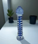 The glass is meticulously crafted with striking blue and white spiral patterns and embedded blue beads, maximizing focused internal friction. Its sturdy material retains heat and cold, allowing you to chill it for an exhilarating, icy sensation or warm it gently for deep, soothing comfort, making it a luxurious addition to any collection.