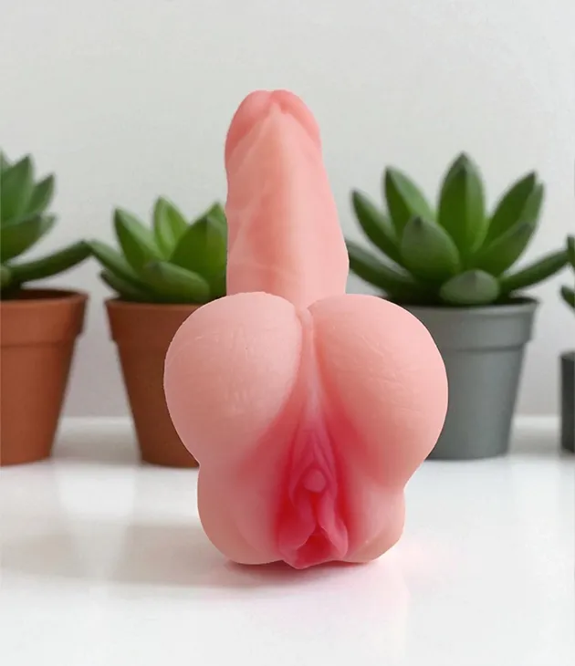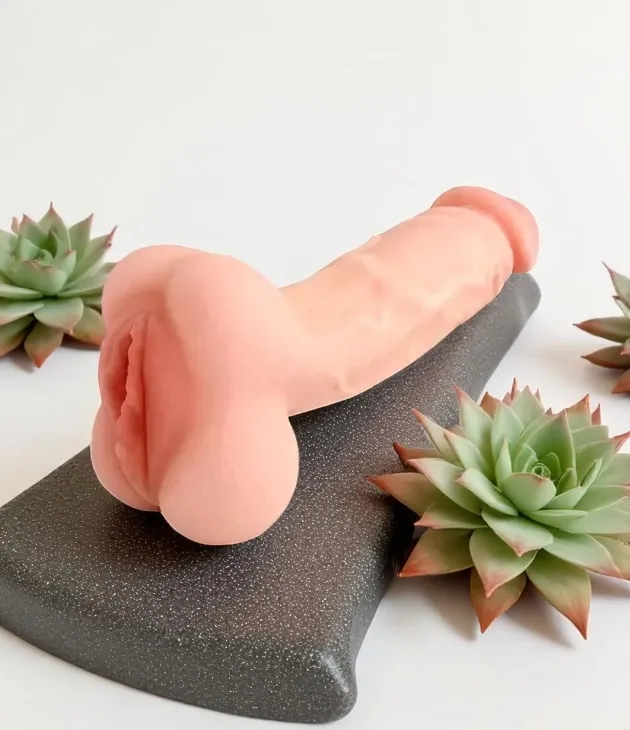 Choose your side—either insert into the textured sleeve or use the silicone dildo for penetration.